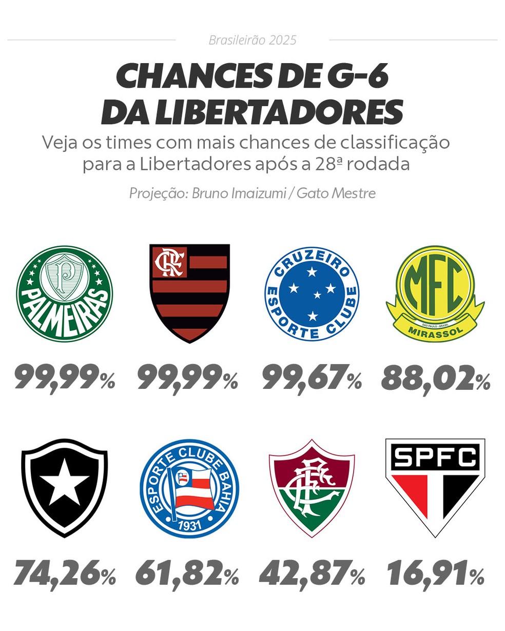 A grande subida da semana, no entanto, pode ser do Bahia. A goleada por 4 a 0 sobre o Grêmio fez as chances de G-6 subirem de 61,82% a 71,79%. As possibilidades de G-4 estão em 16,28%. Só que, neste meio de semana, o Tricolor vai receber o Internacional em jogo adiado da 14ª rodada e, no próximo sábado, visita o São Paulo.